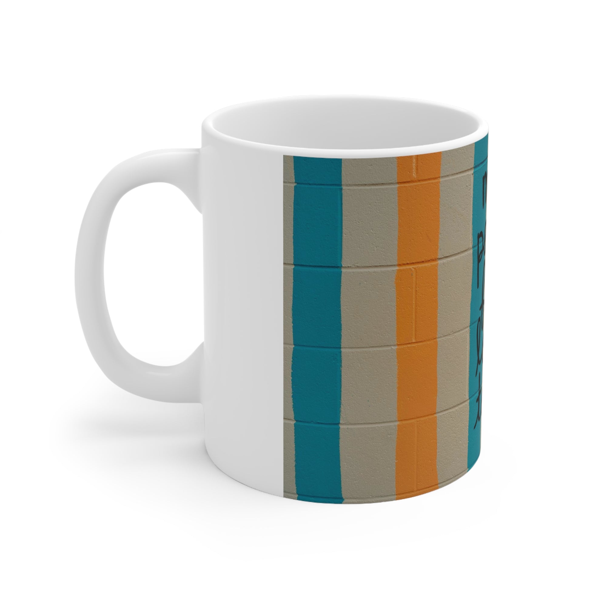 Now, let's talk about the design. This mug is striped with blue, green, brown, and orange. It's like a beautiful sunset over a calm ocean, a peaceful forest, a cozy campfire, and a ripe pumpkin all rolled into one. It's a feast for the eyes, folks!